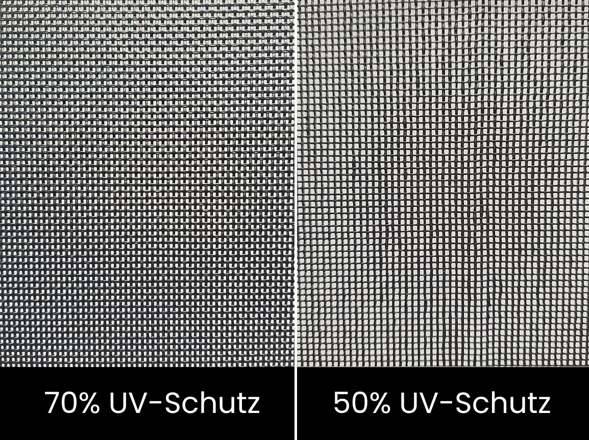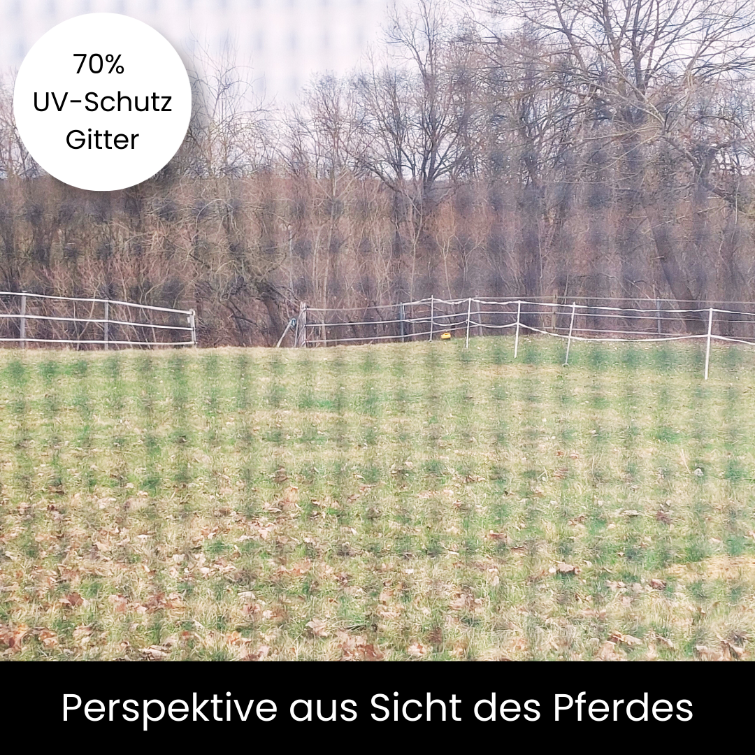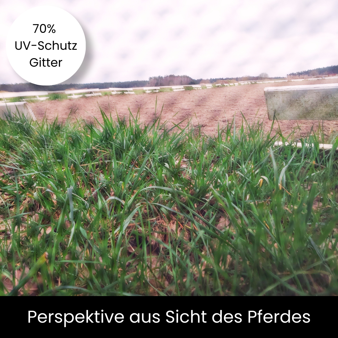 Der Unterschied liegt im Grad der Lichtdurchlässigkeit: 50% UV-Schutz ist luftiger und heller, während 70% UV-Schutz deutlich mehr Sonnenstrahlen filtert und sich besonders für empfindliche Pferde eignet.